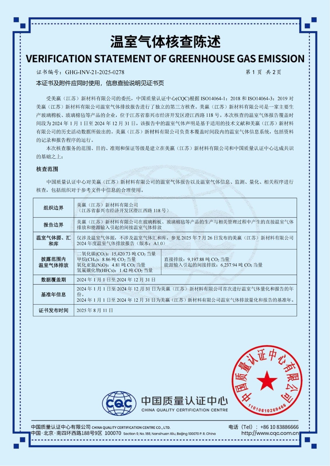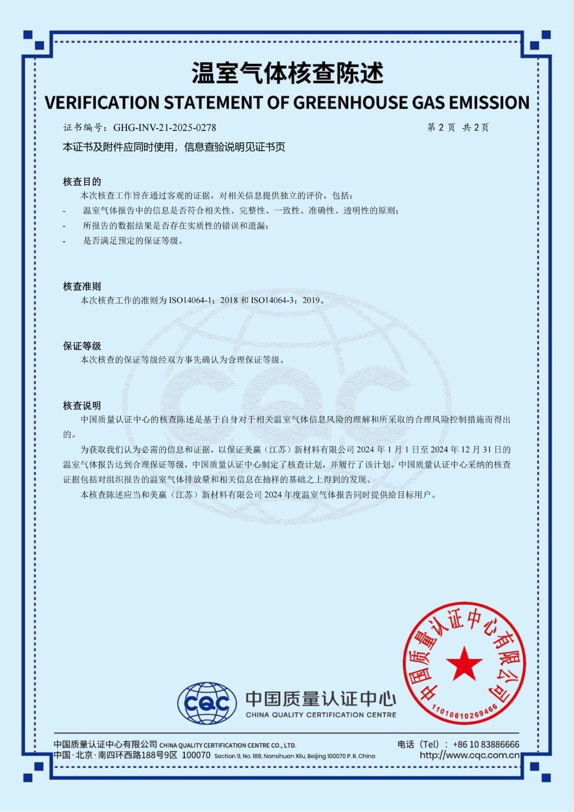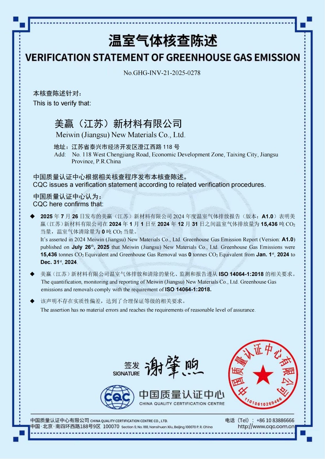 赢胜旗下全资子公司美赢(江苏)新材料有限公司通过 CQC 温室气体核查陈述并获得产品碳足迹认证