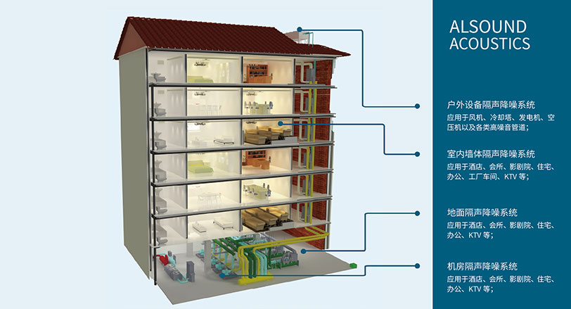 民用建筑是指非生产性的居住建筑和公共建筑,噪声来源包括建筑外环境噪声、建筑内部噪声、建筑屋面/室外噪声。 针对不同噪声来源及不同应用场所,赢胜分别设计制定了户外设备隔声降噪系统、室内墙体隔声降噪系统、地面隔声降噪系统、机房隔声降噪系统,定向解决民用建筑噪声问题。